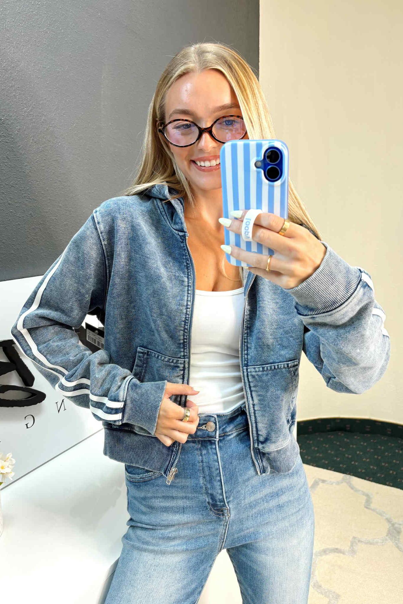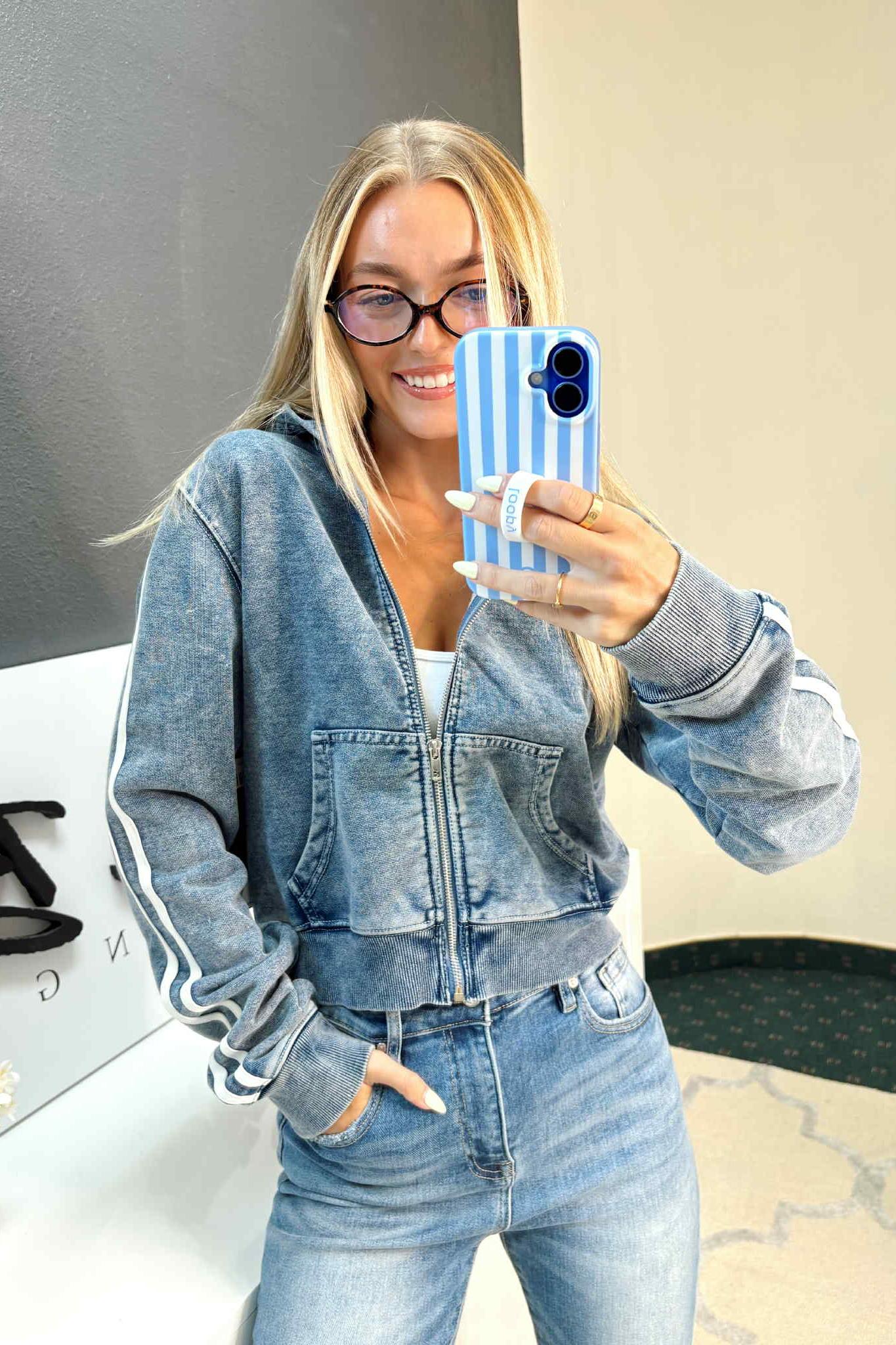 A long sleeve mineral washed denim blue zip-up hoodie with racer stripe sleeves and front pockets. French terry and super comfy! True-to-size fit—hits right at the waist with these high-waisted jeans.