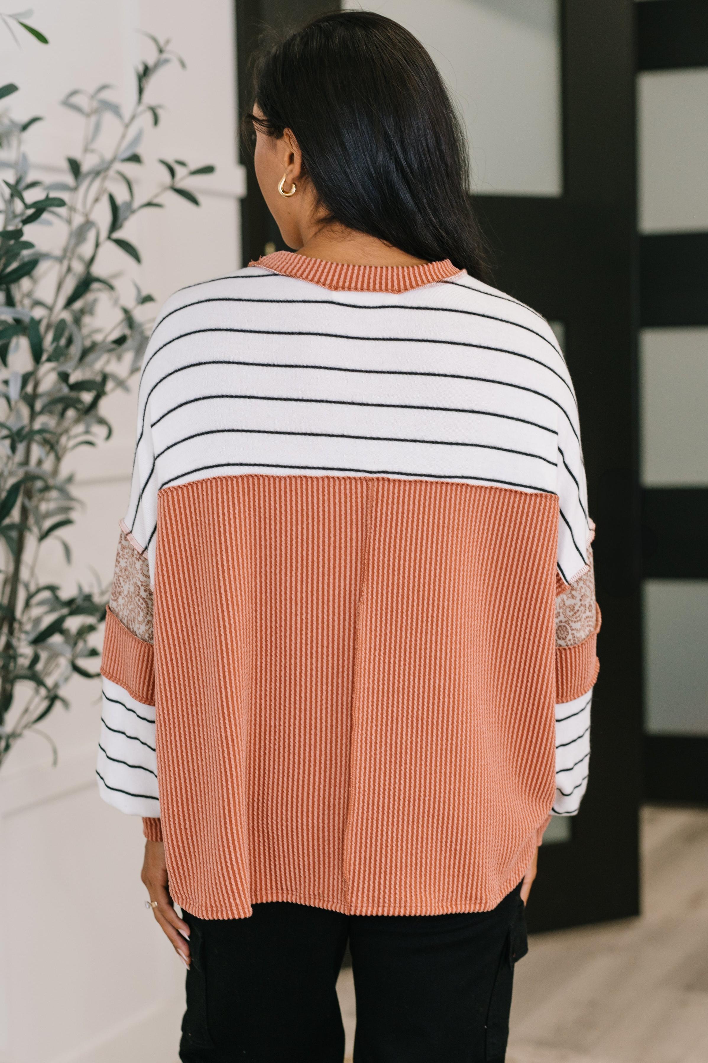 The All Over the Place Color Block Relaxed Pullover mixes cozy cable ribbed knit with a soft French Terry contrast for playful texture and high stretch comfort. Its banded round neckline and drop shoulders create an easygoing vibe, while the banded, gathered sleeve cuffs and scooped hemline add fun, flirty details. Perfect for relaxed days filled with style and ease.